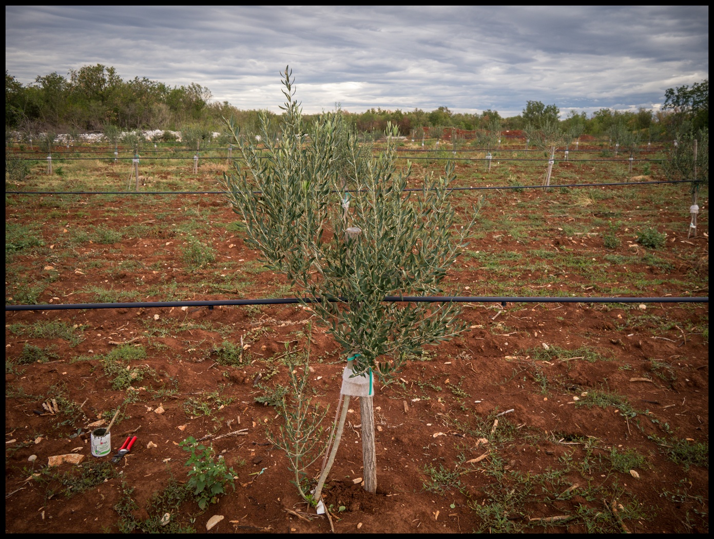 Whilst waiting for the olive fruits to reach the perfect stage for picking, the work in the orchards never stops. One of the things that demand attention at the moment is the preparation of the young orchards for the upcoming winter. Humidity and strong winds may take their toll on the still not fully developed plants, therefore the need to prune the young trees.